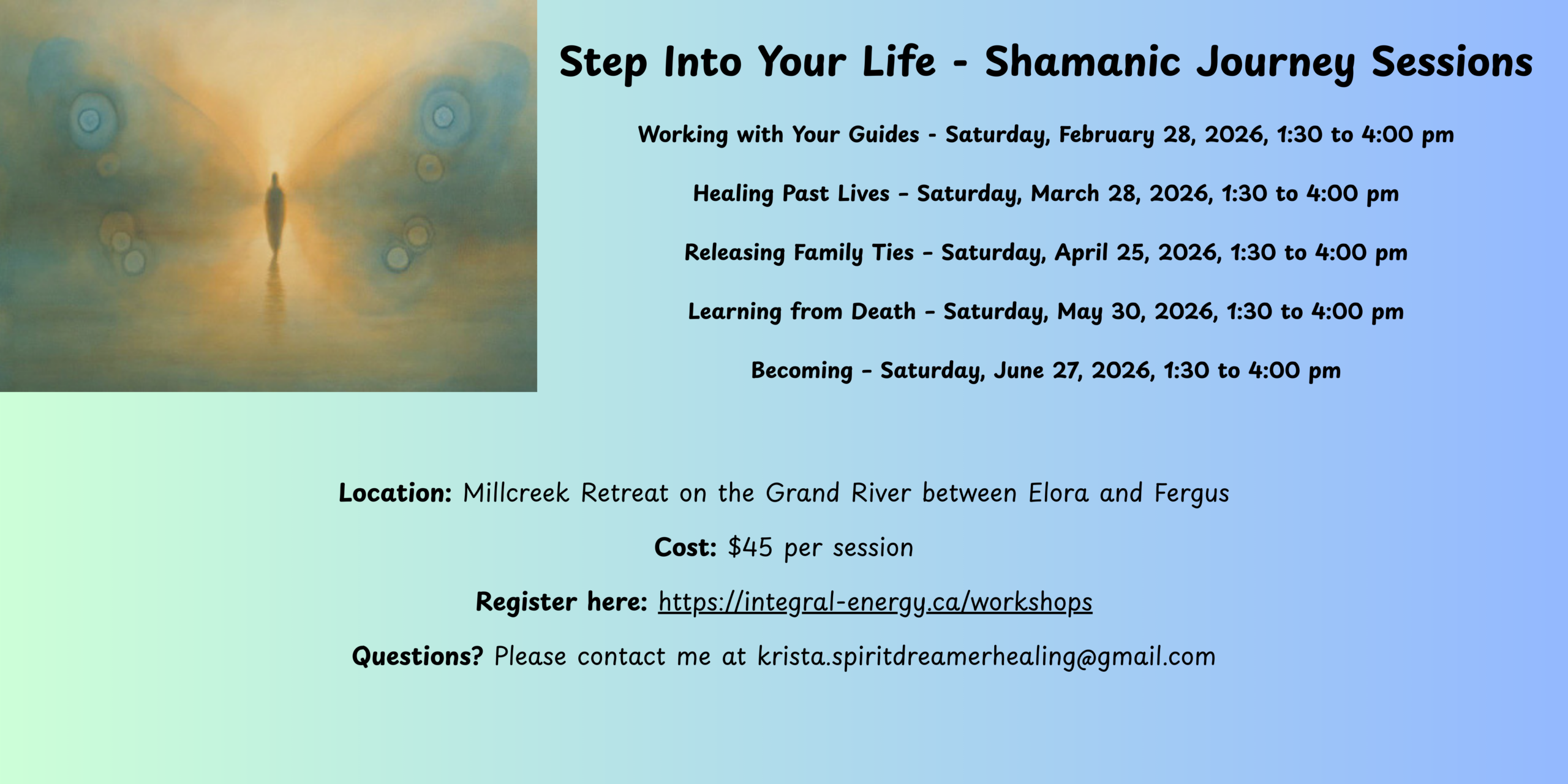Join me at Millcreek Retreat on the beautiful Grand River for a series of shamanic journey sessions to release old patterns and step into your life from a place of deep wisdom. Register here: https://integral-energy.ca/workshops.